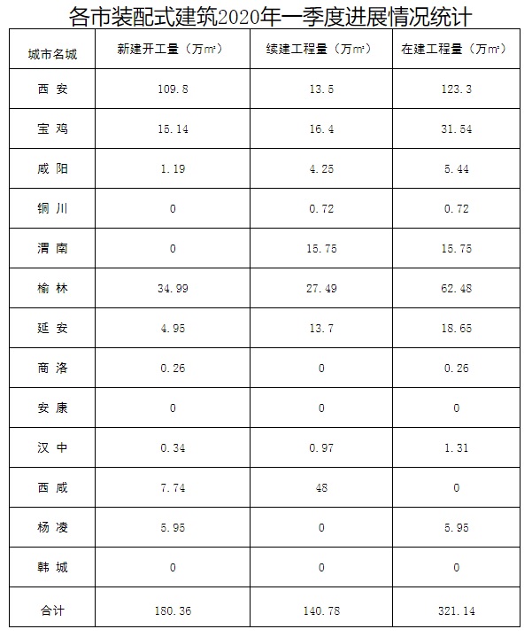 (二)項(xiàng)目建設(shè)。根據(jù)重點(diǎn)項(xiàng)目建設(shè)計(jì)劃及疫情防控等需求,西安市公共衛(wèi)生中心、西安咸陽(yáng)國(guó)際機(jī)場(chǎng)分流檢測(cè)中心等工程開(kāi)工建設(shè)、投入使用。一季度裝配式在建建筑面積共321.14萬(wàn)平方米,其中新開(kāi)工180.36萬(wàn)平方米、續(xù)建140.78萬(wàn)平方米。(具體情況見(jiàn)附表)